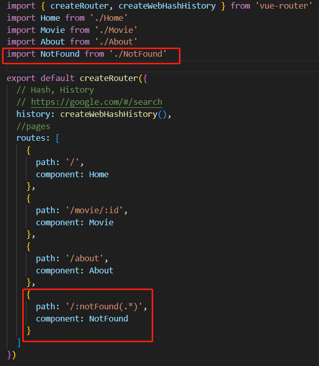 routes폴더 안에 NotFound.vue를 만들고 위와 같이 작성하면 됩니다.