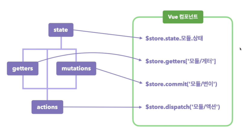 Vue 컴포넌트에서 해당 Vuex를 가져오려고 하면 $store. 를 붙여서 사용합니다.