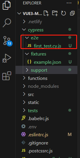 프로젝트 cypress폴더 안에 e2e폴더 생성 후, first_test.cy.js파일이 생성된 것을 확인할 수 있습니다.