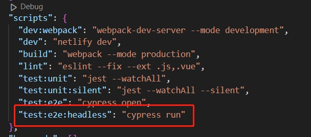 package.json파일 scripts부분에서 cypress run명령어를 등록합니다.