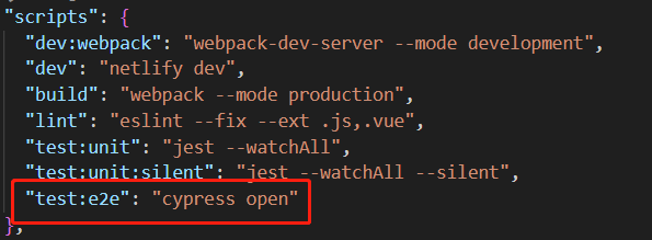 package.json 파일 scripts부분에 cypress를 추가합니다.