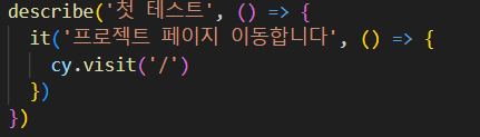 jest문법와 비슷합니다. 대신 cypress는 it을 사용하며, cy도 사용됩니다.