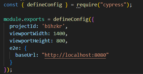 cypress.config.js파일에서 viewport의 너비와 높이 그리고 기본 url를 설정해줍니다.