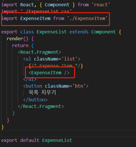 ExpenseList.js파일에 ExpenseItem.js파일을 엘리먼트 방식으로 작성합니다. 그리고 위에서 import해주면 됩니다.