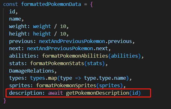 DetailPage의 index.jsx에서 formattedPokemonData에 description 추가합니다.