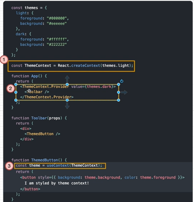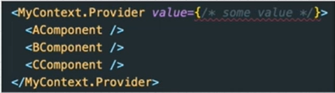 현재 context value는 트리에서 호출 구성 요소 위에 가장 가까운 <MyContext.Provider>의 value prop에 의해 결정됩니다.