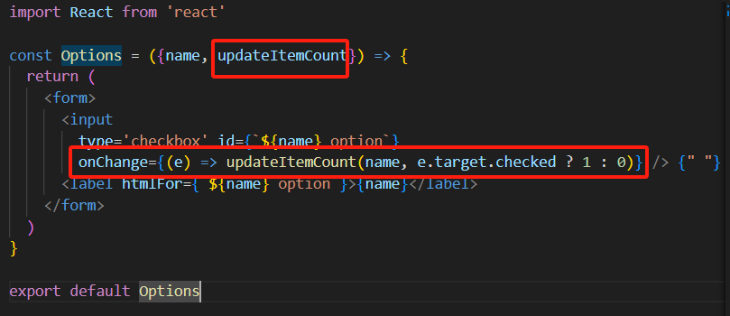 Options.js의 추가 코드는 체크여부에 따라 가격이 올라감으로 1혹은 0입니다.