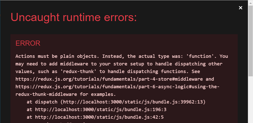 Actions은 객체여야 하는데 현재는 함수를 dispatch하고 있습니다. 그러기 때문에 에러가 생깁니다.