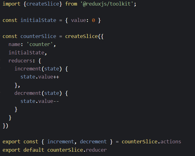 createSlice 함수는 reducer함수의 대상인 초기 상태(initialState)와 "slice이름"을 받아 reducer와 상태에 해당하는 액션 생성자와 액션 타입을 자동으로 생성하는 함수입니다.
