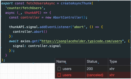 thunk 실행이 중지가 되고 rejected action이 dispatch되었지만 http request는 계속 실행됩니다.
