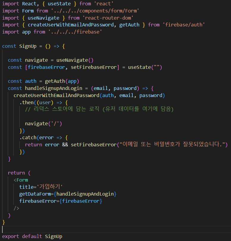 SignUp과 SignIn에서 받아온 getDataForm 및 firebaseError을 사용합니다.