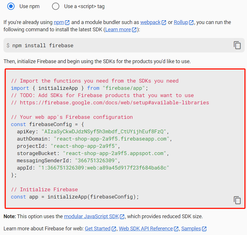 src폴더안에 firebase.js파일을 생성한 후 오른쪽 빨간 박스 부분을 복붙합니다.