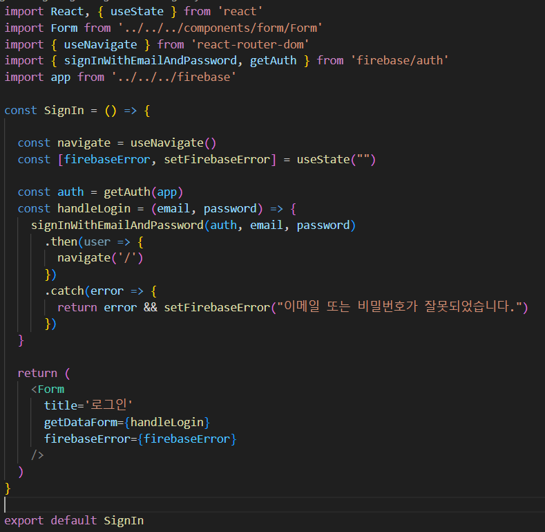 SignUp과 SignIn에서 받아온 getDataForm 및 firebaseError을 사용합니다.
