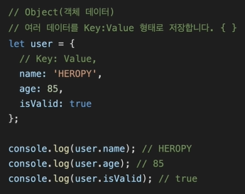 object 데이터는 여러 데이터를 key:value 형태로 저장합니다.