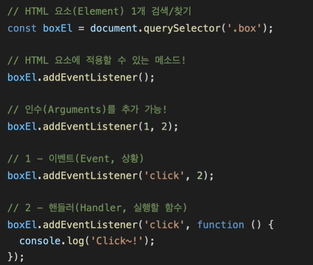 addEventListener 메소드를 사용해 핸들러와 실행할 함수를 알려줄 수 있습니다.